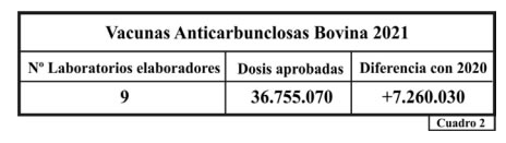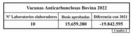 Se produjeron y aprobaron 16.057.705 dosis de Vacuna Anti carbunclosa cepa Sterne, elaboradas por 10 Laboratorios biológicos, por un total de 23 series, aprobadas por el organismo de control SENASA, unas 398.325 más que el pasado año. Creemos que un promedio de +/- 22 millones de dosis anuales sería una cifra adecuada para mantener una respuesta de rodeo inmune, razonable con la magnitud ganadera de nuestro país (Cuadro 2)