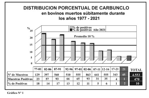 Después de 46 años de monitoreo de una de las principales zonas de cría bovina del país, debemos recordar los quinquenios 1987-91 y 2002-06 con 93 muestras positivas cada uno (19 Brotes promedio anual) que marcaron los momentos más críticos del Carbunclo en la Pcia. de Bs. As. La perseverancia de la evaluación constante y un accionar de la epidemiologia participativa dinámica y comprometida (Veterinarios rurales/Ganaderos), hicieron que “Funcionarios Políticos”, en el 2014, pusieran en vigencia operativa la Ley 6703-61 con la Resolución 115-2014 que obligo la vacunación de los bovinos en todo el territorio de la Pcia. de Buenos Aires por intermedio de las Fundaciones, centralizada en la COPROSA Bs.As. y de ese modo bajar la cantidad de brotes del quinquenio 2017-2021 a 1 brote promedio por año, demostrando que el control sistematizado y coherente rinde sus frutos.