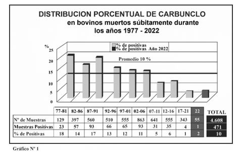 CONCLUSIONS: a) Bacillus anthracis continued to be isolated and identified in the Province of La Pampa. b) The monitoring of “suddenly-dead bovines” must be implemented, with isolation and identification of the agent causing such death in the Provinces of Buenos Aires, La Pampa and Río Negro, in order to maintain active epidemiological Alerts and Responses, within the comprehensive framework of the WHO-WOAH-FAO’s “One Health” initiative. c) The production and annual application of the Anti-Carbuncle Vaccine must continue in force since it is the only logical way to control this “spore-forming” bacteria in the environment.