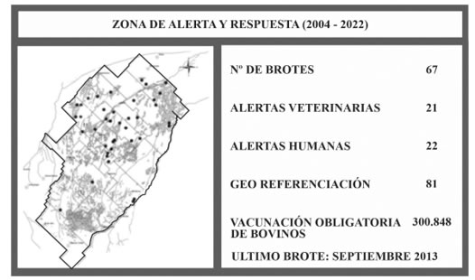 2- Alert and Response Zone, District of Azul (2004 – 2023): Since 2014, a uniform performance has been maintained with no Carbuncle outbreaks. Both Cattle Breeders and Rural Veterinaries maintain an outstanding epidemiologic commitment, and they comply with vaccination of the livestock, the monitoring of suddenly-dead animals, and the efficient elimination of bovine corpses.