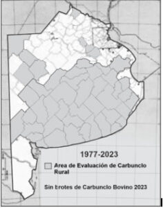 1- Assessment Area of Rural Carbuncle in the Province of Buenos Aires (1977-2023): During this year, there were NO outbreaks of Carbuncle; 43 samples were assessed from 22 Districts of this Area, and all of them turned out to be negative. After 46 years of assessment, it is necessary to remember some outstanding periods due to the number of outbreaks: 1987-1991 with an average of 19 outbreaks per year, and 2002-2007 with the same number of outbreaks. Perseverance in constant assessment and dynamic communication of knowledge caused “officers close to politics” to enforce the provisions of Law 6703-61, Resolution 115-2014, making it mandatory to vaccinate bovines in this Province. The good results were observed in the five-year period from 2017 to 2021, going down to an average of 1 outbreak per year.